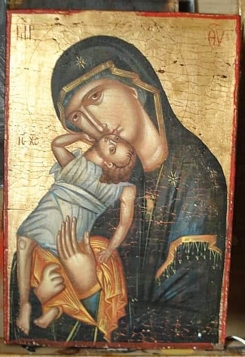 Handpainted Icon with natural wood on canvas with egg tempera pigments and Gold leaf 22 karat.
