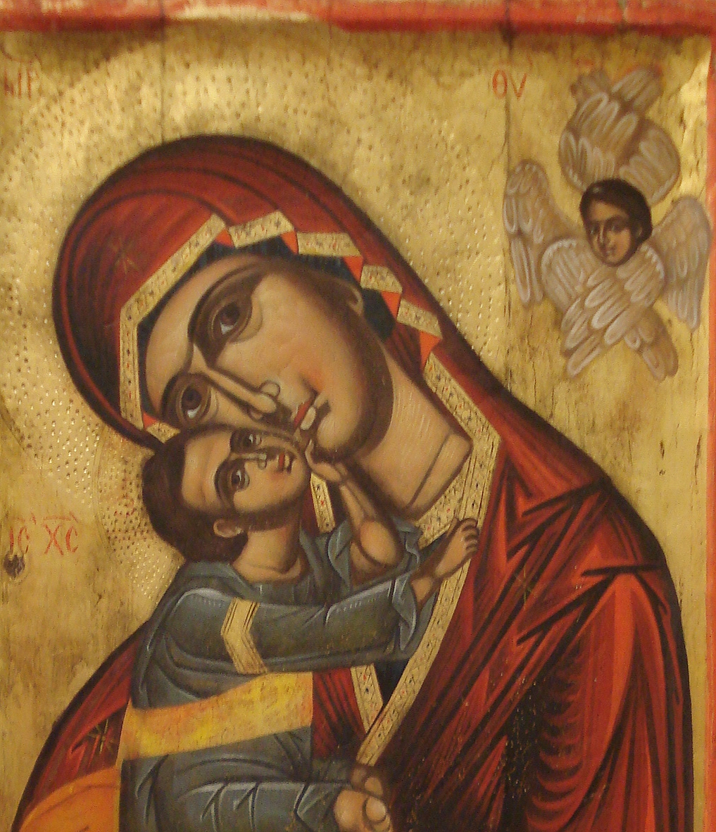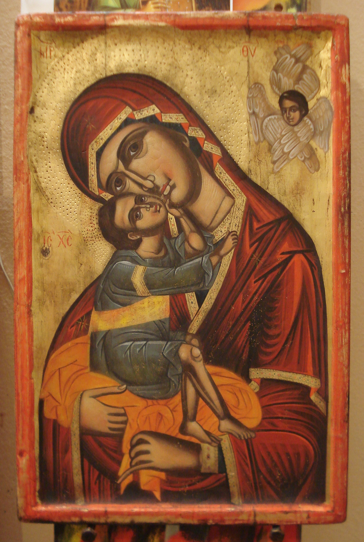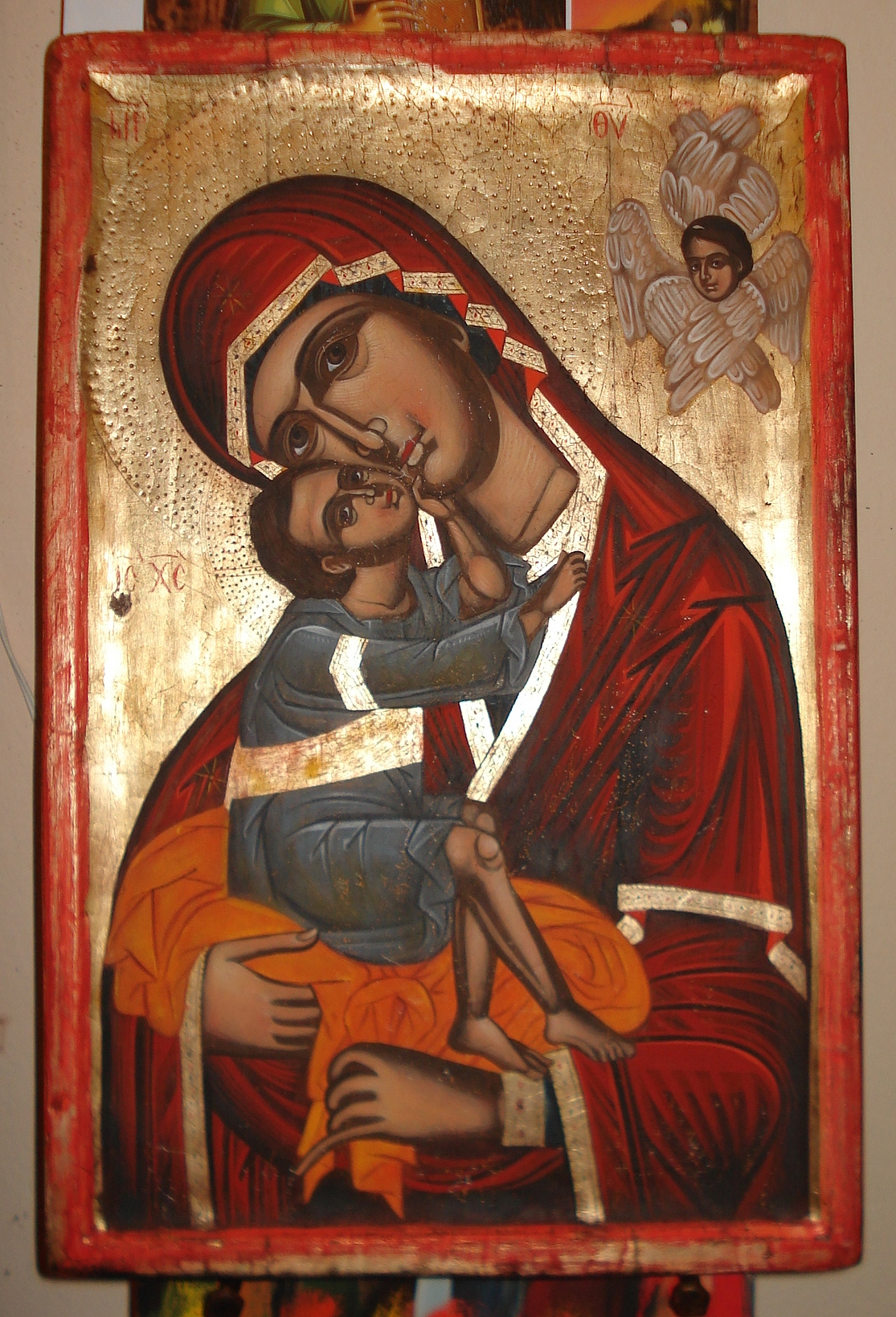 Mother of God Maria Glykofilousa.Handpainded icon with pigments,egg tempera,and gold leaf 22karat.carved wood.Dimension 28x43cm.
